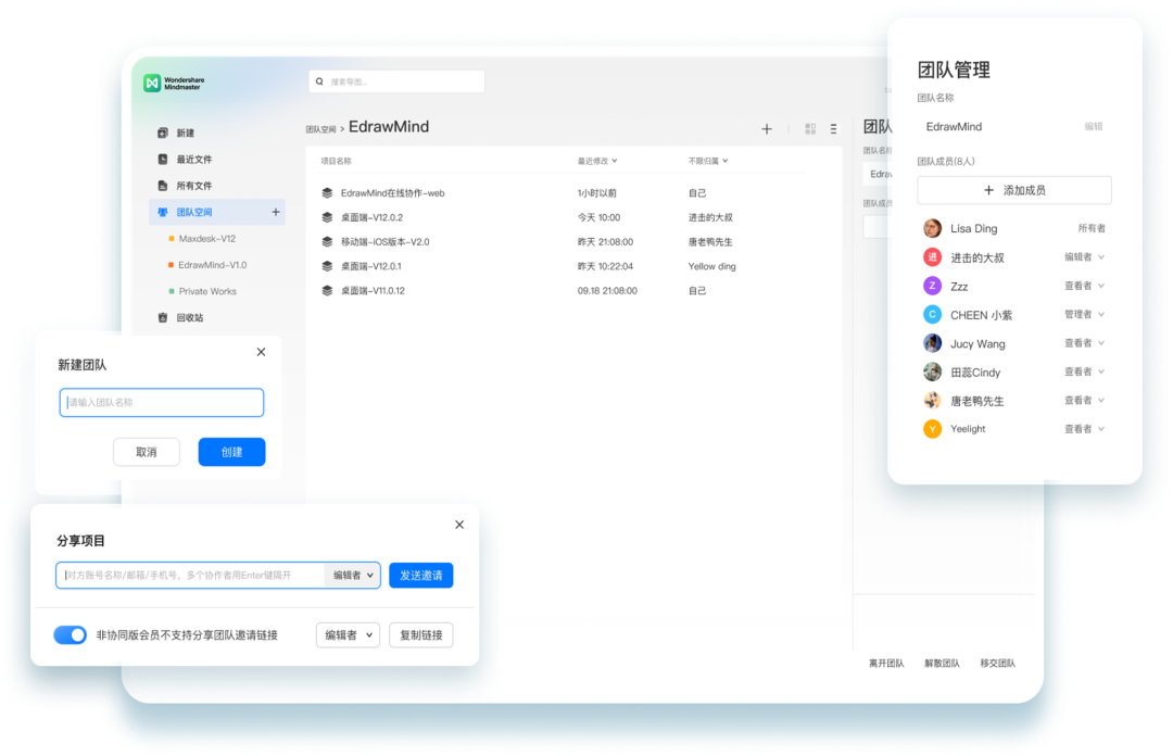可创建团队项目空间,文件层级关系清晰,随时随地灵活管理成员权限,轻松共享及协作编辑团队文件,提高团队协作效率 。通过邀请链接进入脑图页面的成员会自动进入协作者列表,管理员可以通过权限控制,对协作者的权限进行操作,选择关闭或者删除访问权限,保障文档的安全性。