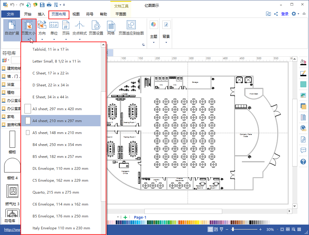 第1步:“页面布局”菜单,点击“页面大小”,选择你需要的页面尺寸,点击“更多页面大小”可自定义页面大小。
