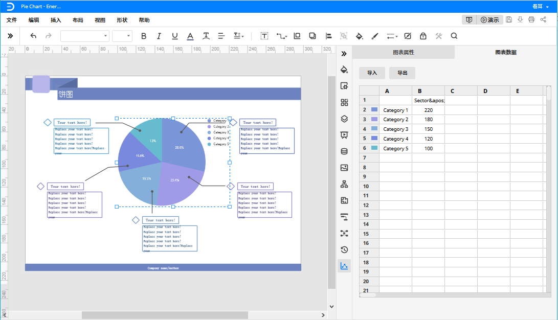 第四步,双击文本框,将饼图模板内的文字替换为符合自己需求的文字。