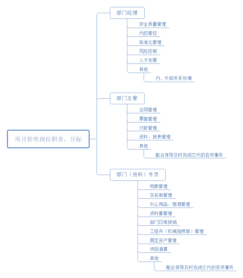 项目管理岗位分为部门经理、部门主管和部门资料专员。部门经理主要负责安全质量管理、内控管理、标准化管理、风险管控、人才发展等方面。部门主管则主要负责财政、人力方面的管控,包含合同管理、票据管理、付款管理、资料及报表管理等。