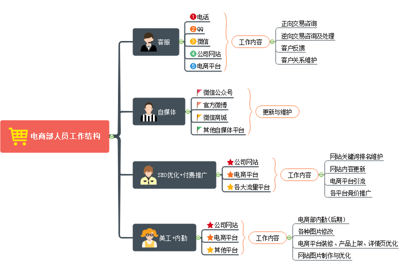 那么,电商部的人员到底是如何分配工作的呢?下面跟着这张思维导图一起来了解一下吧!