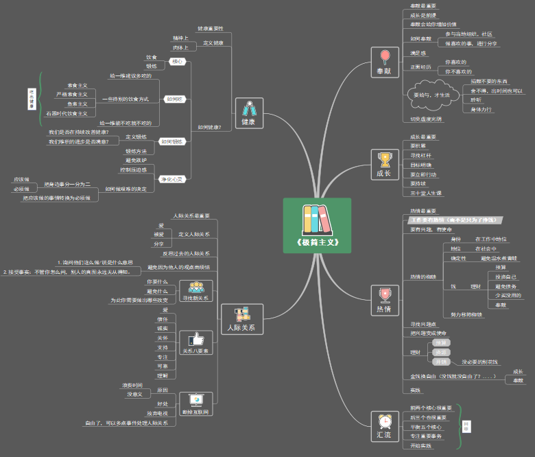 极简生活如何让生活过得富有真意?书中从五个维度出发:健康、人际关系、热情、成长和奉献。我们一生都在追求快乐,但很少静下心来思考何为快乐?快乐不是重点,过有意义的生活才是我们一直要寻找的。如果我们在生活中找到了意义所在,那么长久的自律、专注下,快乐只是一种生活的副产品而已。下面,通过一张思维导图了解这一生活方式。