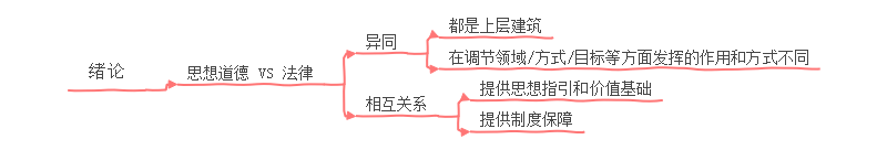 内容的开始是绪论,主要讨论思想道德和法律二者的关系。首先是比较异同,它们都是上层建筑,但发挥的作用和方式不同;其次二者是有联系的,思想道德为法律提供思想指引和价值基础,而法律则为思想道德提供制度保障。