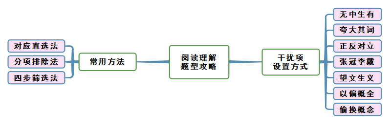 为了干扰我们的判断,题目选项有以下几种常见的错误方式:无中生有、夸大其词、正反对立、张冠李戴、望文生义、以偏概全、偷换概念。选项内容常常和文中部分内容有关联,但是却被进行了增删或拼接等改动,使得看上去“似是而非”。遇到这种情况,我们需要按照上述的七种干扰项设置方式,一一对应,找出选项犯了哪种错误。