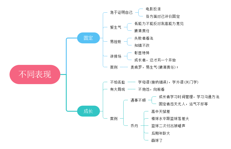 对于两种不同的思维模式不同的表现,我已整理成思维导图的方式更加方便大家直观理解。