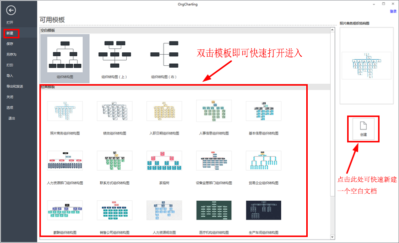 打开软件之后,点击“新建”,然后点击右侧的“创建”来新建一个空白组织架构图,或者双击组织结构图经典模板快速创建。