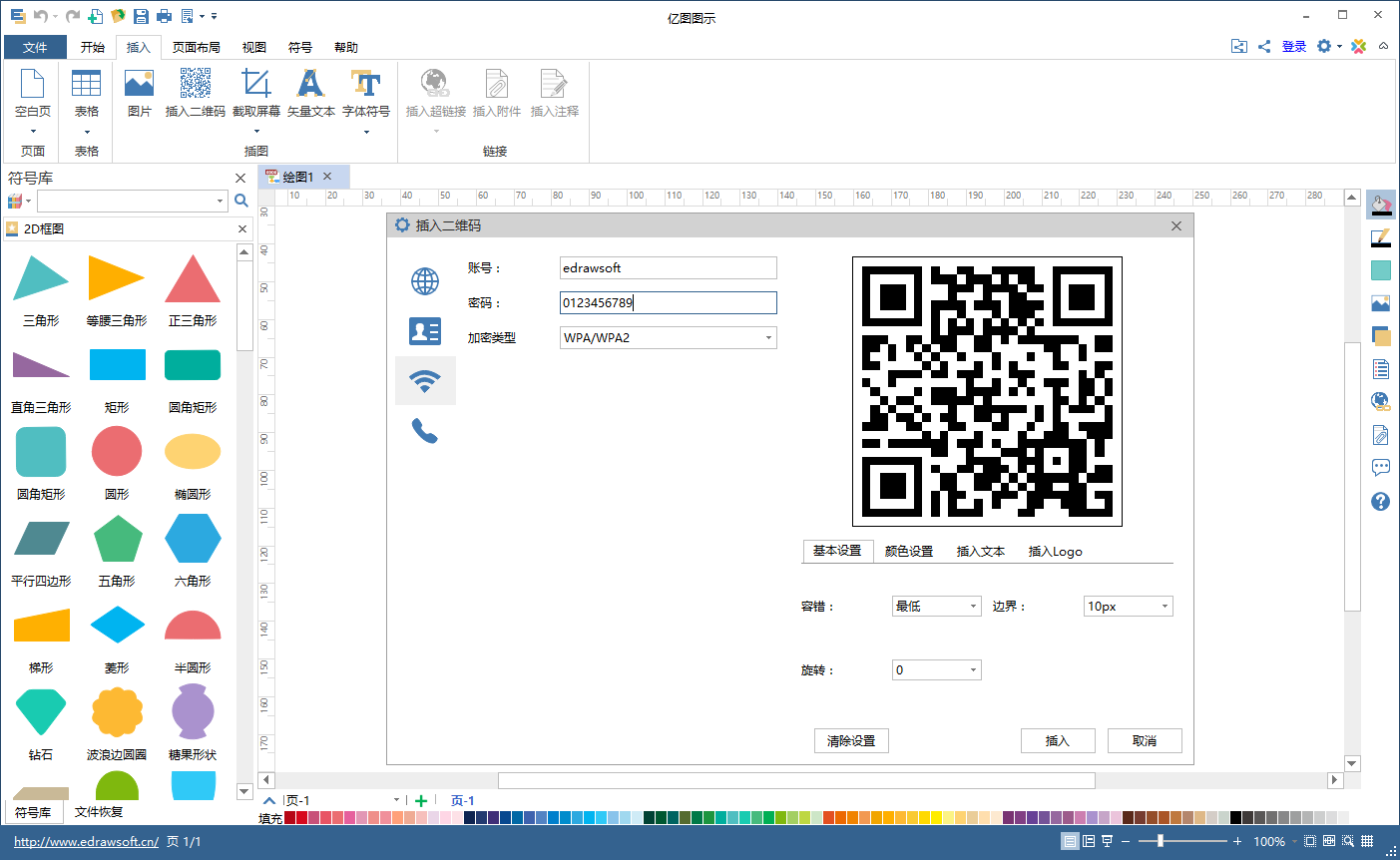 扫一扫领红包,扫一扫加关注,生活中,二维码的运用越来越广泛。在新版亿图图示V9.1软件,新增这项“插入二维码”功能。原本以外这是一个类似“插入图片”一样,需要从外部添加的功能,其实不然。点击按钮,就可以在编辑页面里创作四种类型的二维码。